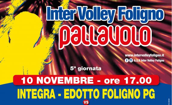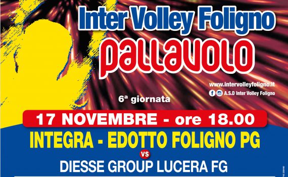 Sabato 17 novembre 2018 ore 18,00 presso la palestra comunale “Fausto Ciccioli” di Foligno, zona Plateatico, si svolgerà la partita di serie B: INTEGRA EDOTTO FOLIGNO – DIESSE GROUP LUCERA FG Domenica 18 novembre 2018 ore 17,00 presso la palestra comunale “Fausto Ciccioli” di Foligno, zona Plateatico, si svolgerà la partita di serie C: EDILPAC…